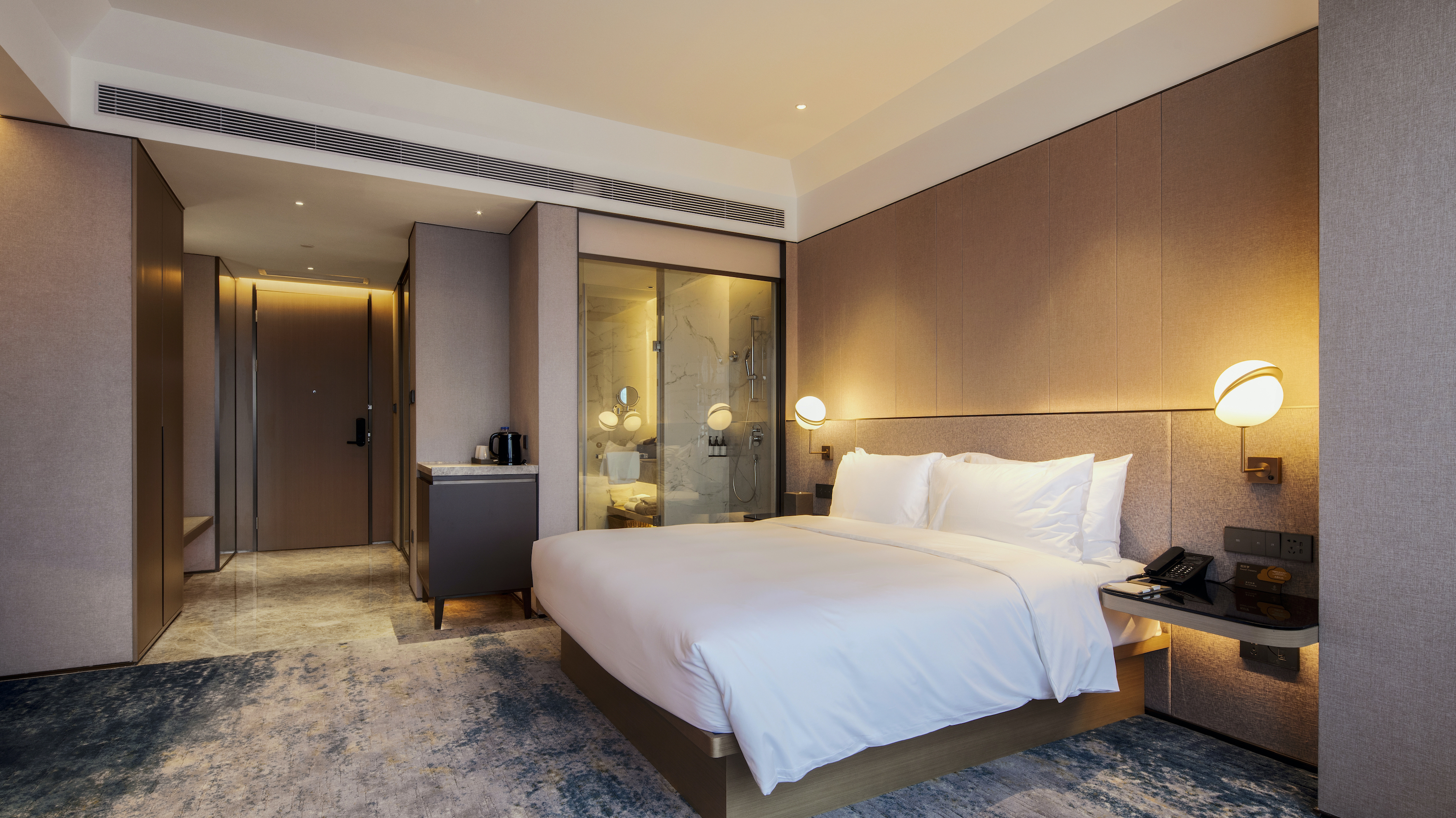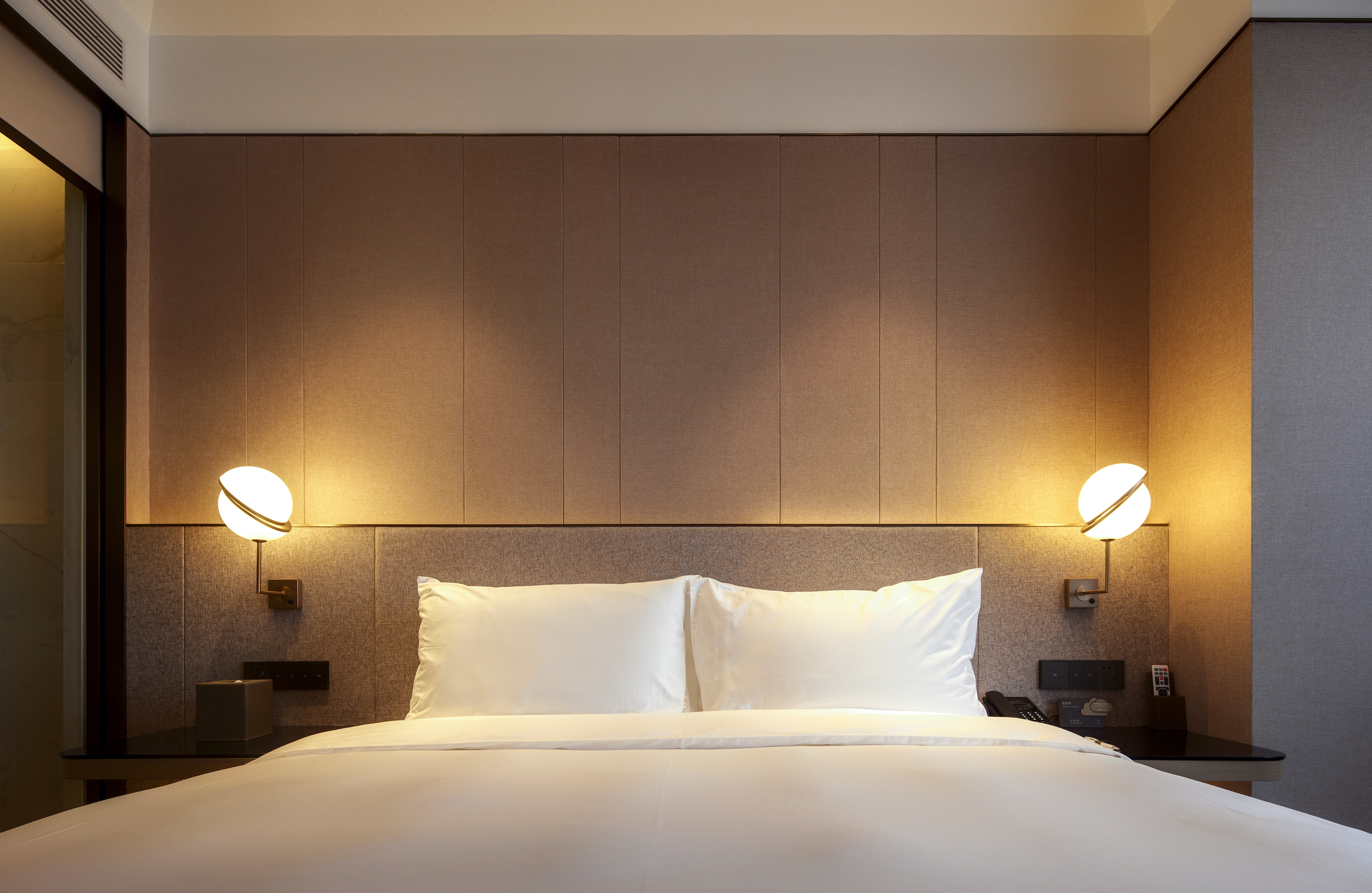简洁的造型,床头板上的暗藏灯槽和白色大理石的半开放式洗手间延续了整体的简约美学,旨在为客人提供宁静祥和的氛围。