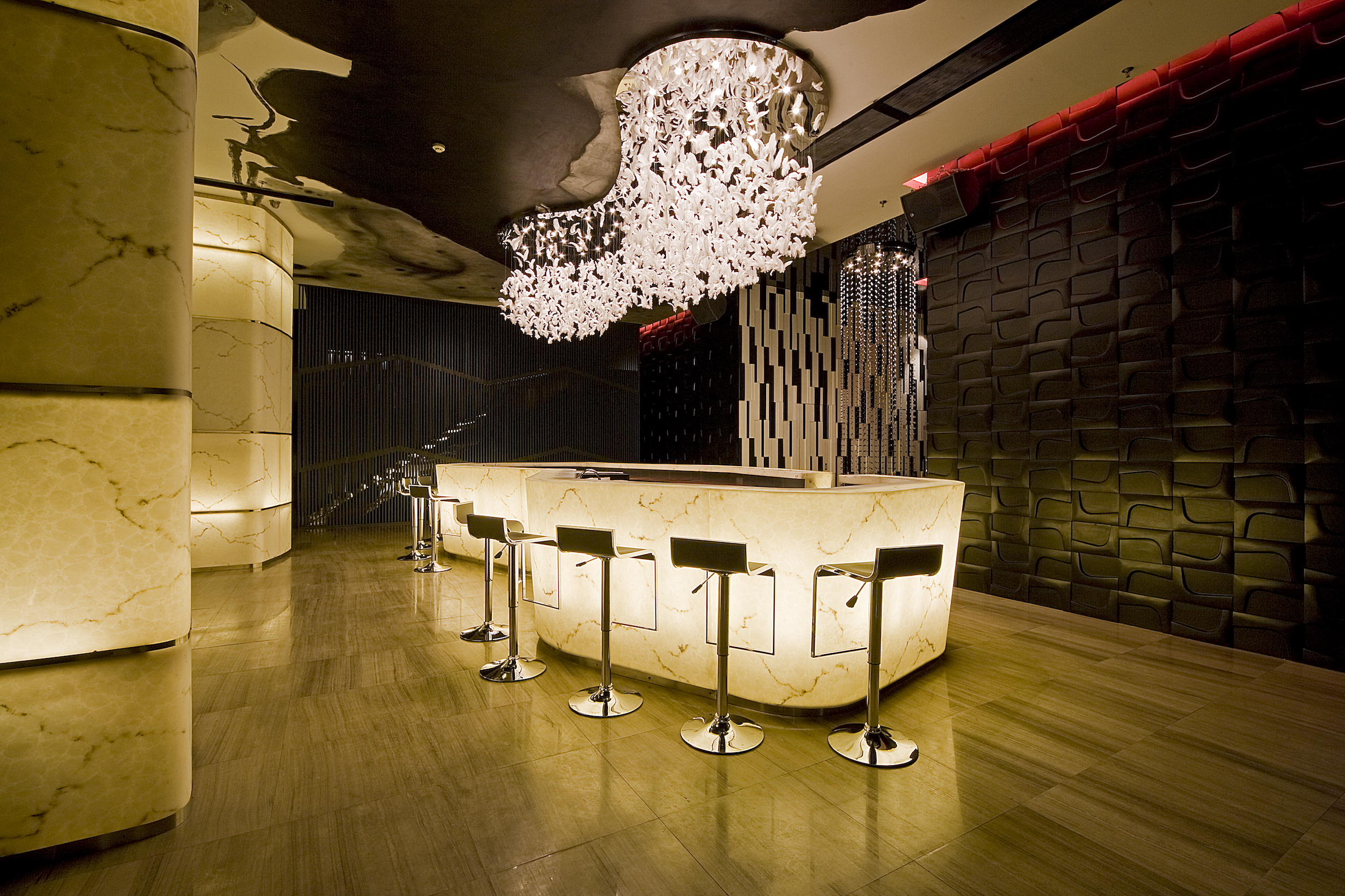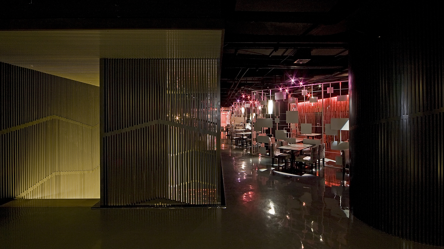 色调的改变演译了中国空间层次的定义, 楼下是光亮的黄色而二楼是深红色。私人空间分别由楼下敞开式的酒吧及二楼的公众大厅到半开放式的圆型包座而至私人贵宾房。