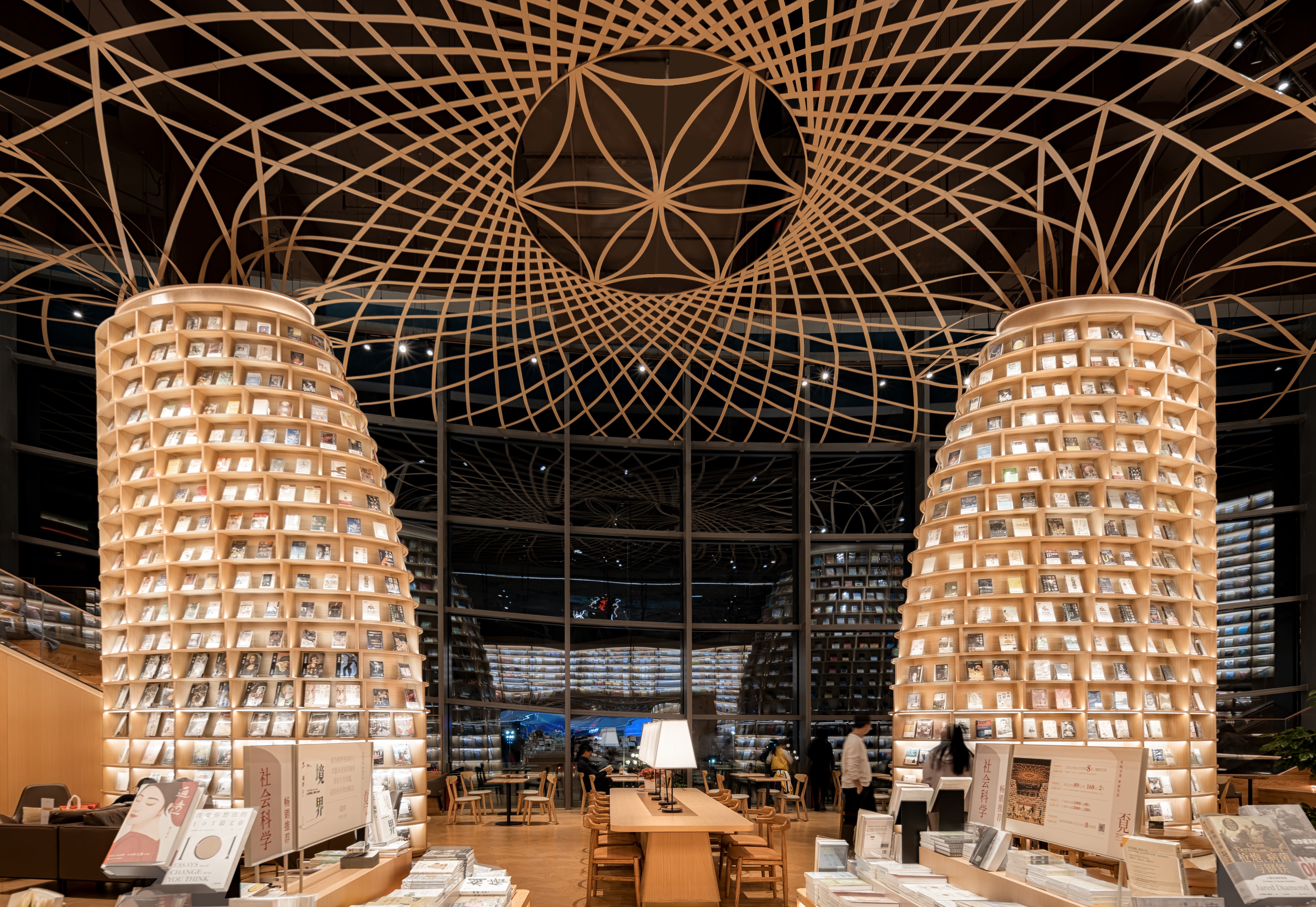 The nature-inspired experience continues in the café zone of the two-story atrium space which features a pair of 8-meter-high column bookshelves as the focal point, resembling two towering trees rooted in this space. All customers are covered under the interwoven ceiling structure that branches out from these distinctive columns, making them feel embraced by a forest. The big-step seating area provides an excellent place for relaxation, with the adjacent full-height curtain wall allows sunlight to flood in, creating a bright and comfortable environment where customers can savor the “slow time” that changes with day and night. The design scheme fully embodies the pursuit of humanistic care, returning to the user's experience and emphasizing the relationship between people and space, fulfilling the concept of "Mi."