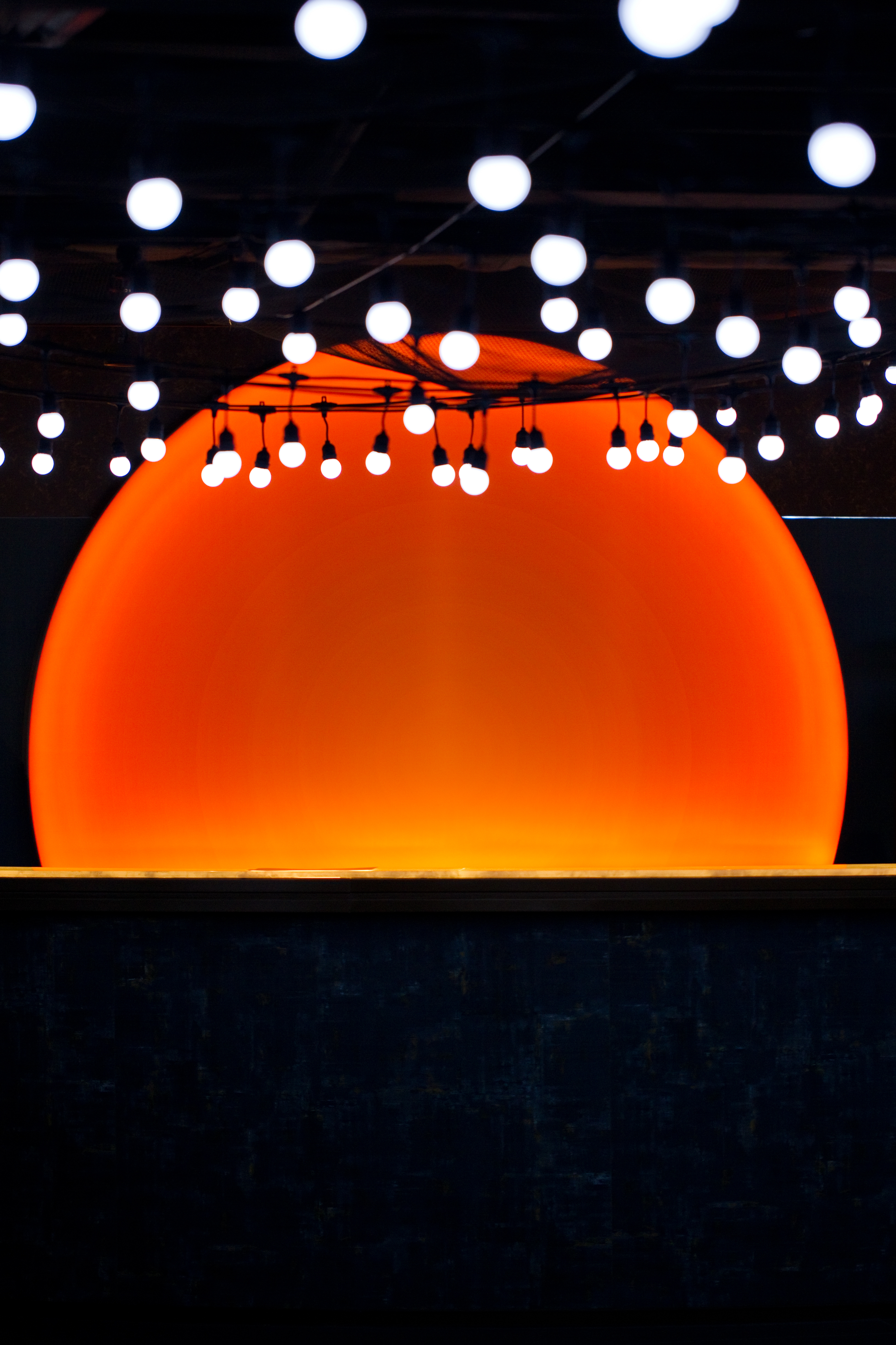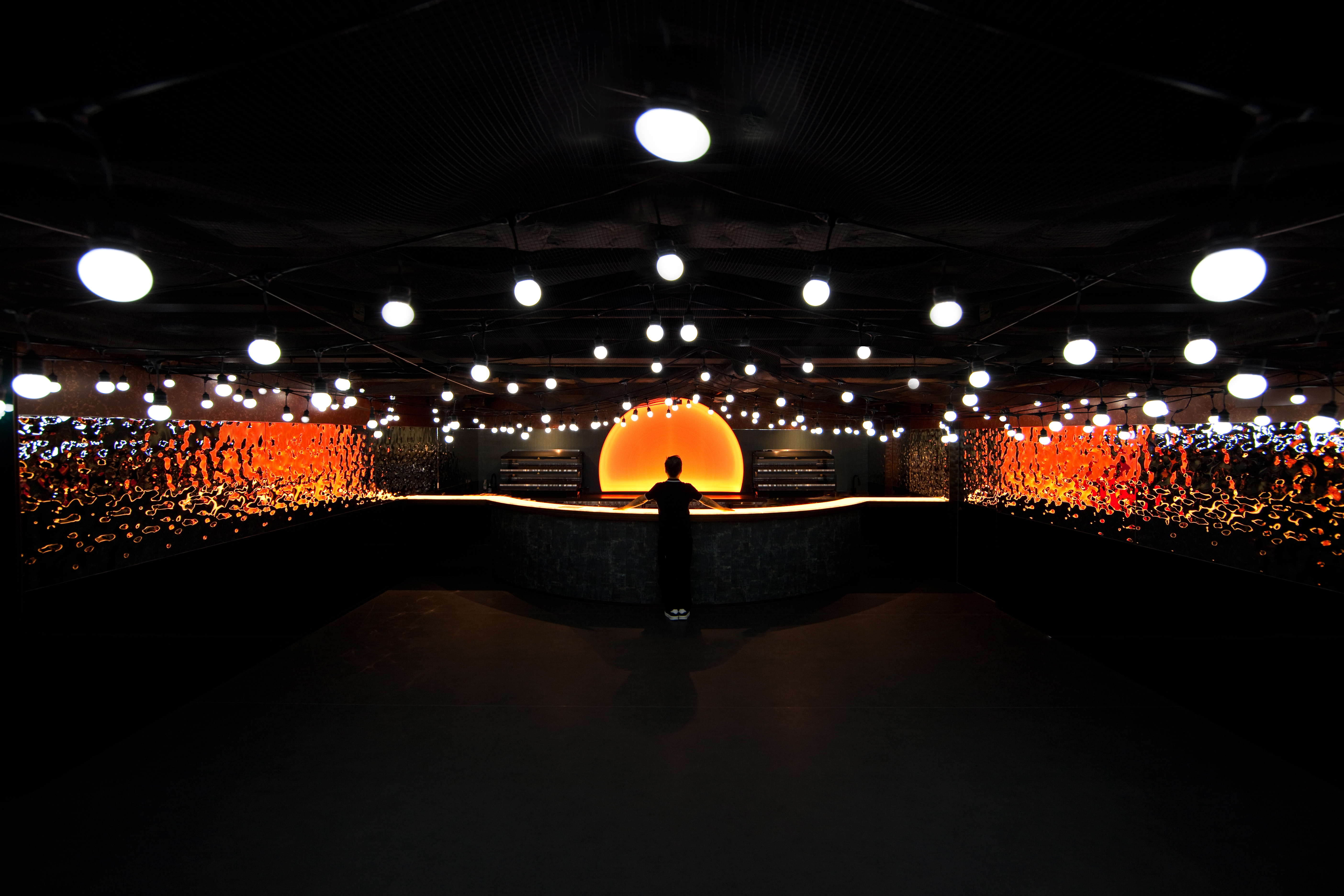 Guests are welcomed by a sun installation positioned behind a reflective copper bar. This simple yet iconic light feature draws in crowds and evokes the serene effect of a sunset over the sea. Copper panel and a reflective stone bar top interact harmoniously with the striking starry light installation, creating a memorable experience within the venue.