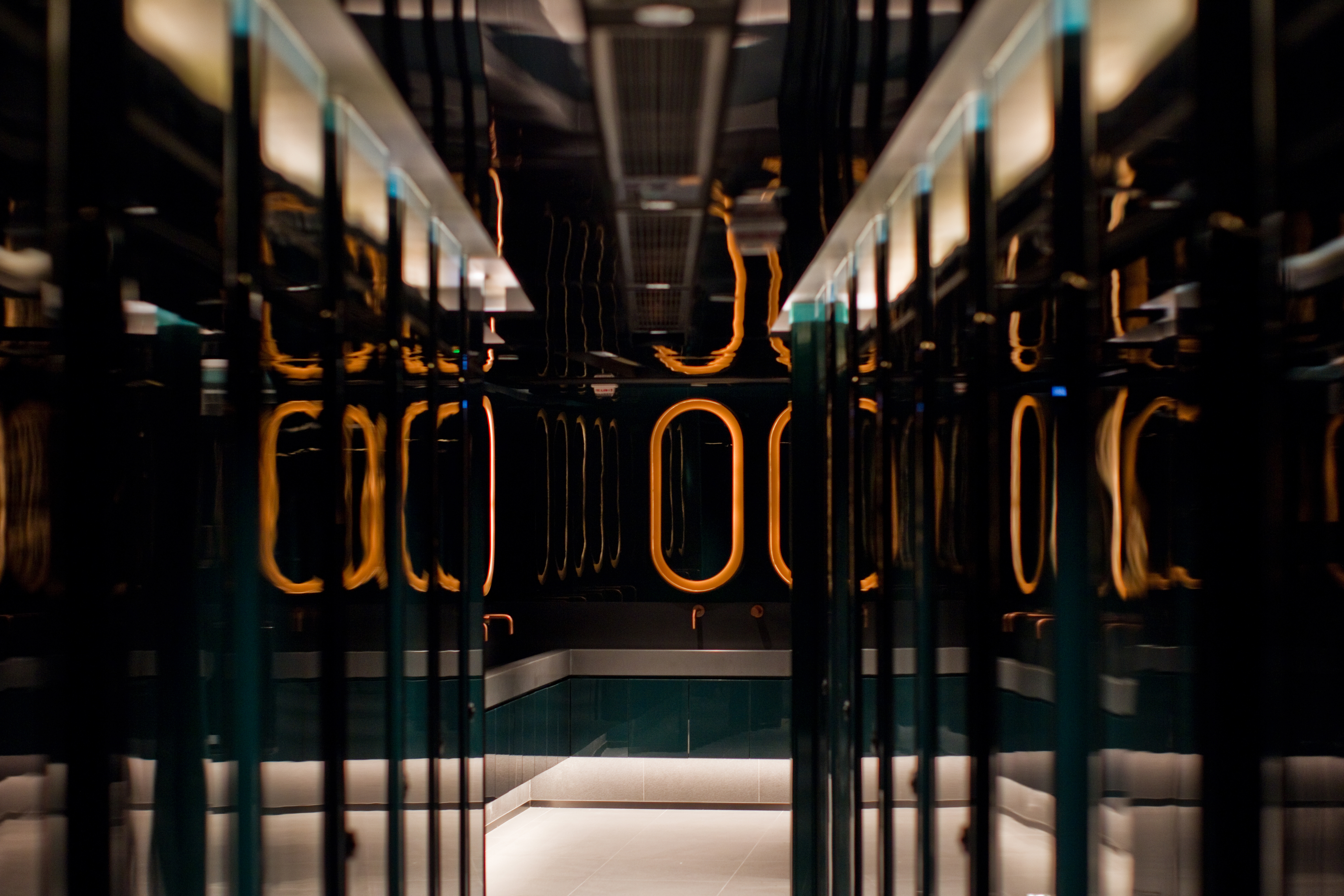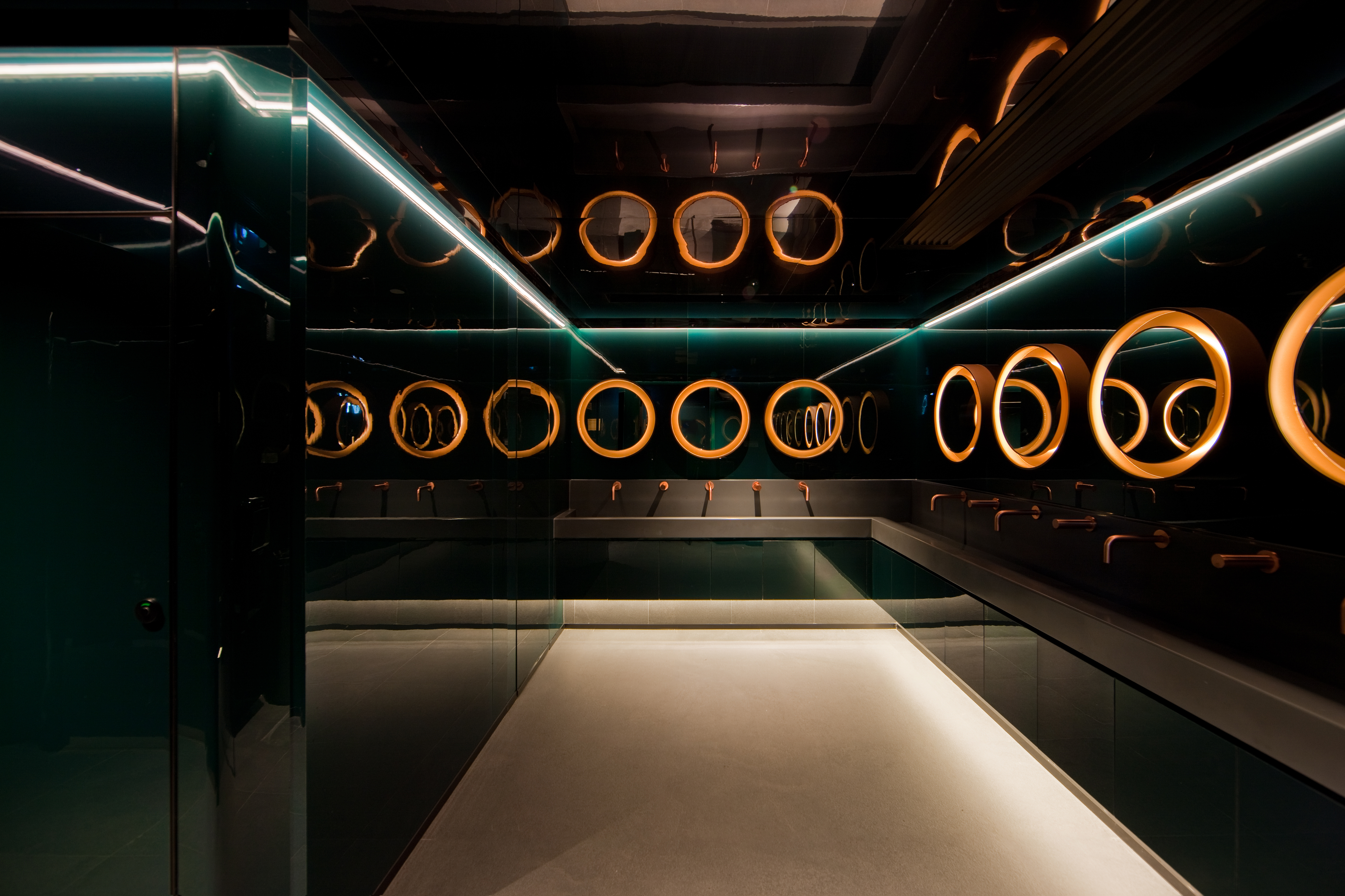 The secondary spaces, such as restrooms, reflect the overall color and material palette of the venue, providing a unique experience that embodies an underwater atmosphere. High-glossed wall treatments and polished steel hardware, combined with illusionary lighting effects, create an ethereal and immersive environment.